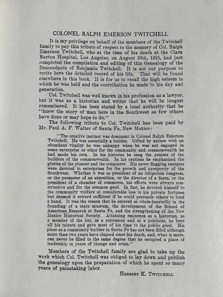 It is my privilege on behalf of the members of the Twitchell family to pay this tribute of respect to the memory of Col. Ralph Emerson Twitchell, who at the time of his death at the Clara Barton Hospital, Los Angeles, on August 26th, 1925, had just completed the compilation and editing of this Genealogy of the Descendants of Benjamin Twitchell. It is not our purpose to recite here the detailed record of his life. That will be found elsewhere in this book. It is for us to recall the high esteem in which he was held and the contribution he made to his day and generation.
