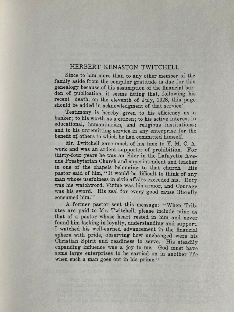 Ralph Emerson Twitchell (RET) dated the preface to the 1929 Twitchell Genealogy book as January 1st, 1920. He then passed away on August 29, 1925. The book is copyrighted 1929 by Herbert Kenaston Twitchell (HKT 1865–1928) who wrote a preface tribute to RET. This is followed by a second preface tribute to HKT. One senses a strong collaboration over many years to complete the work.